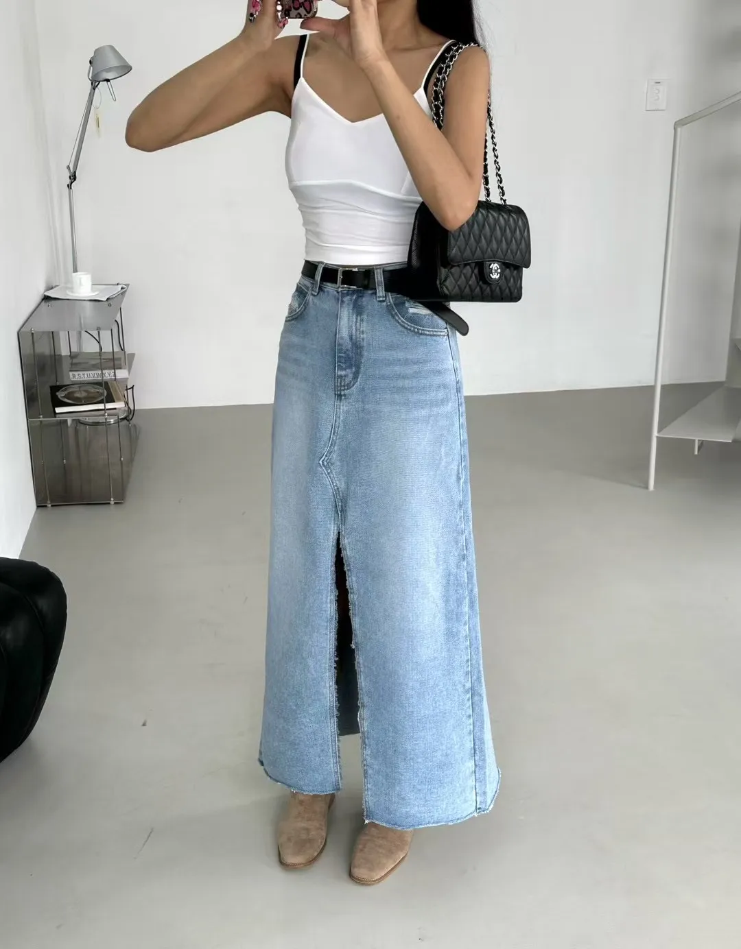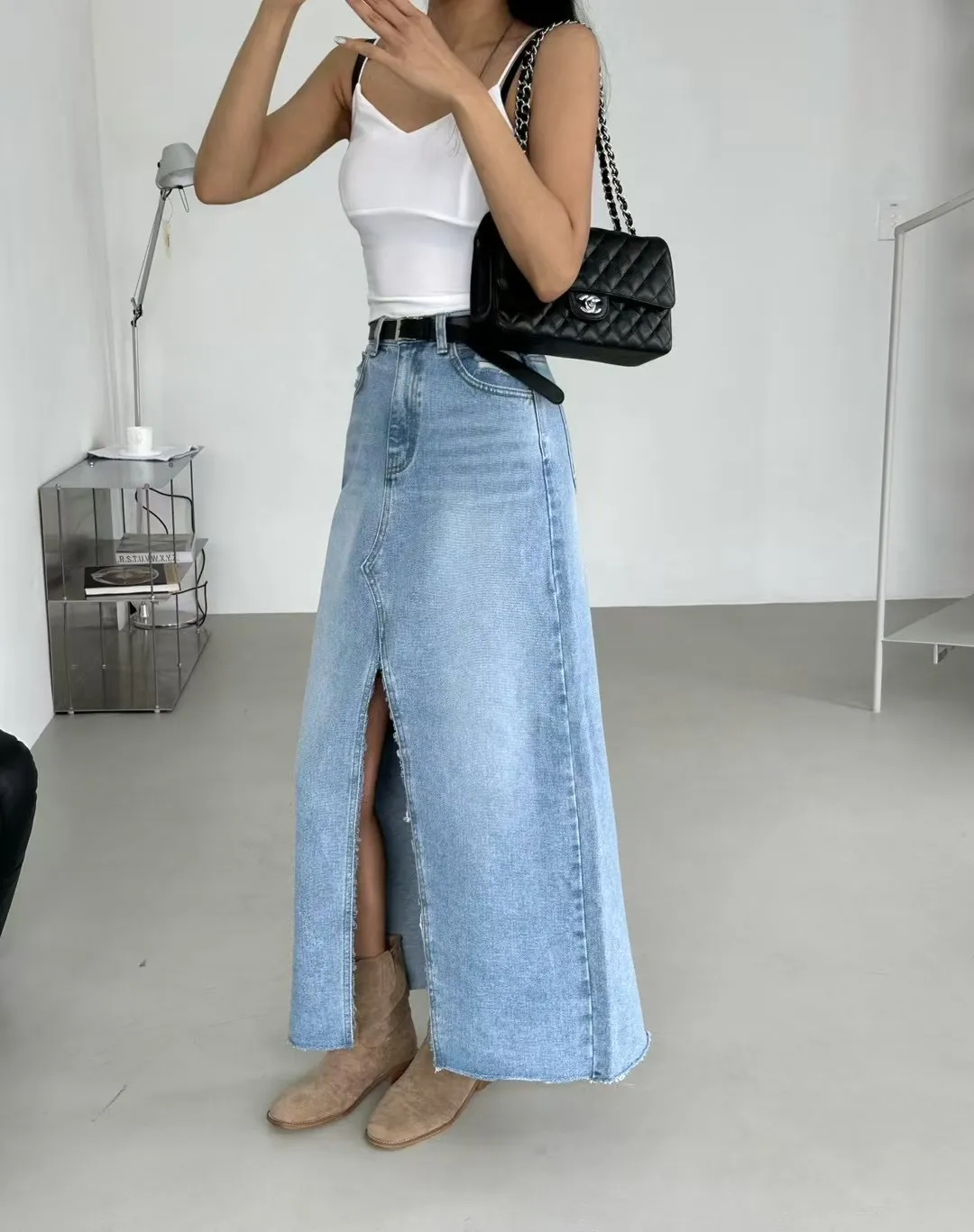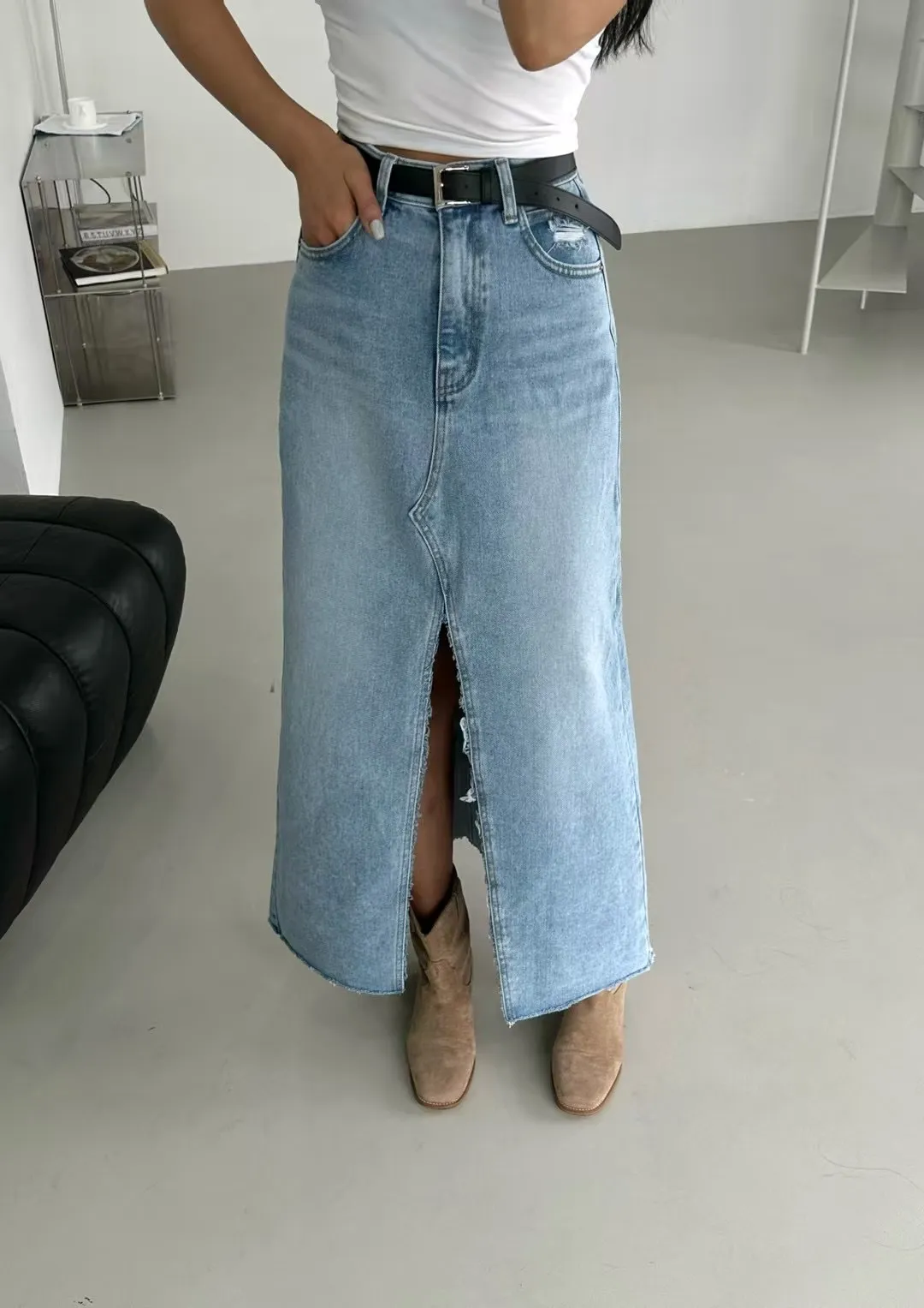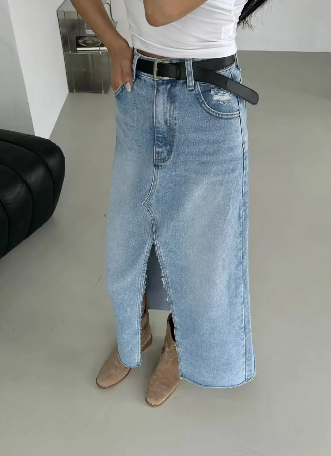 刷白前岔牛仔裙