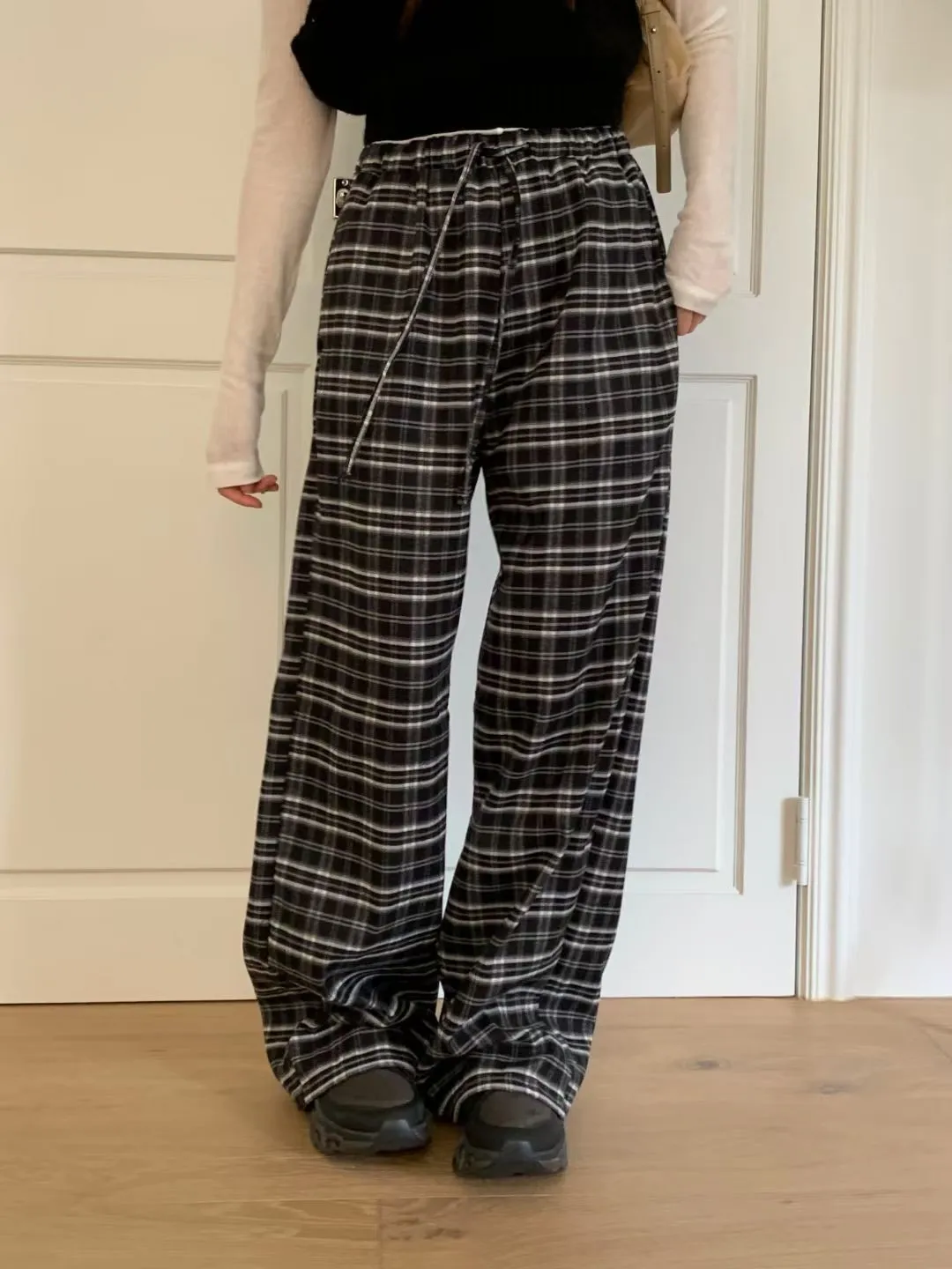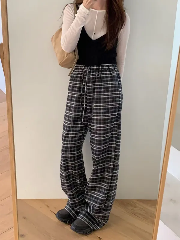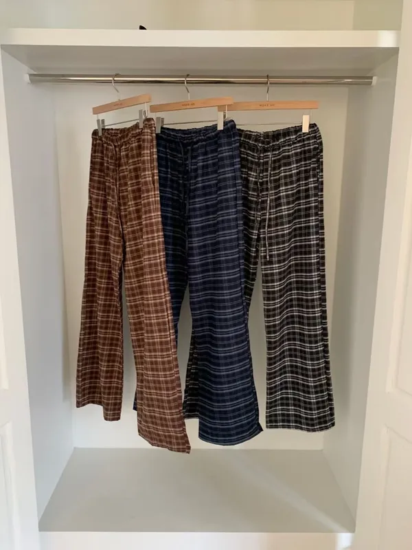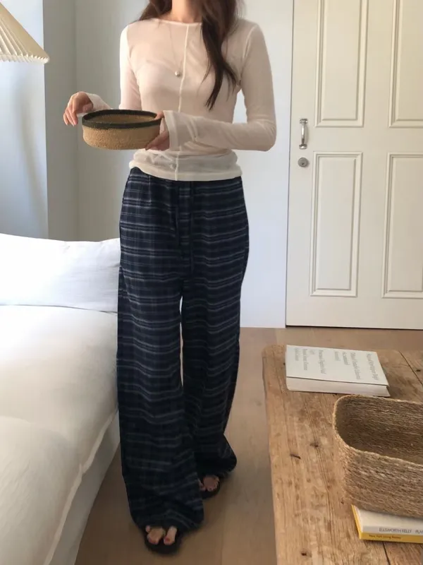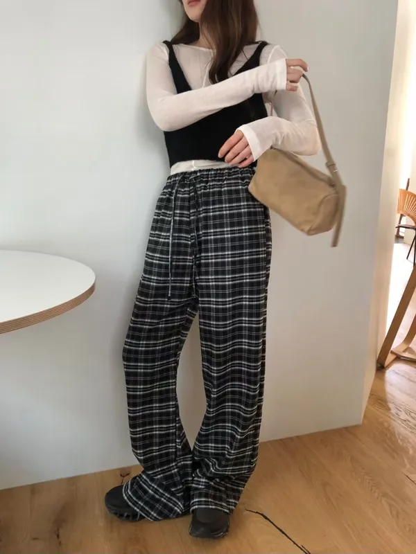 綁帶彈性格紋寬褲(3色)