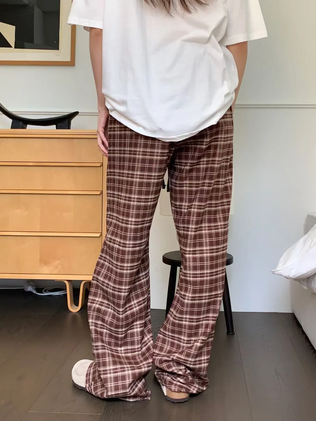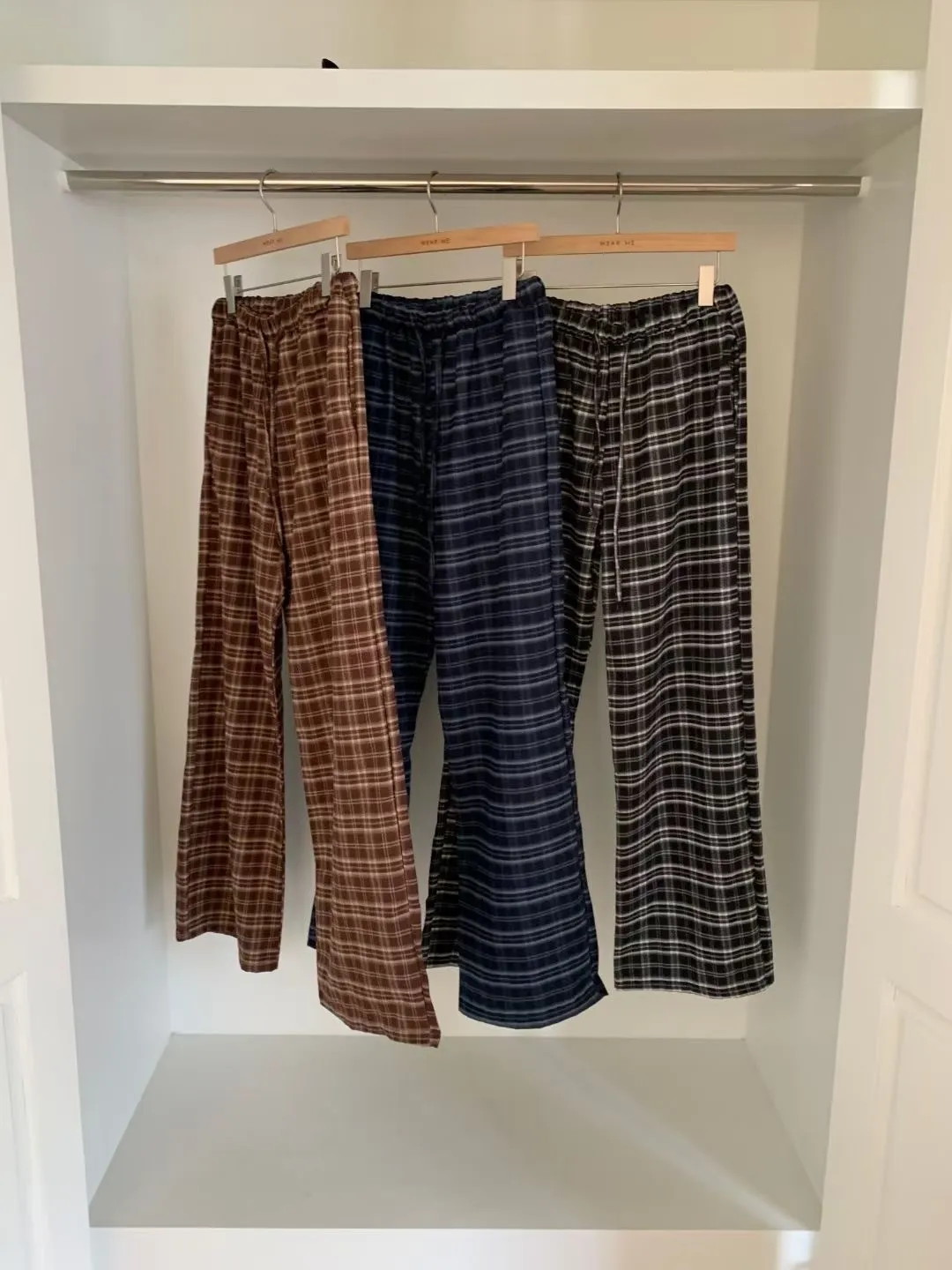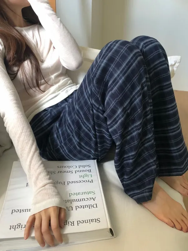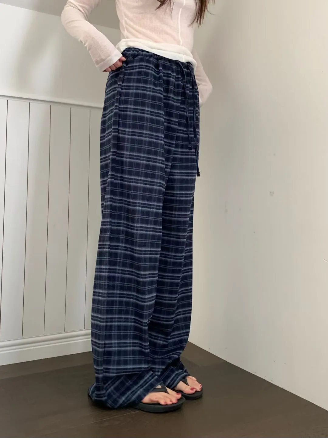 綁帶彈性格紋寬褲(3色)