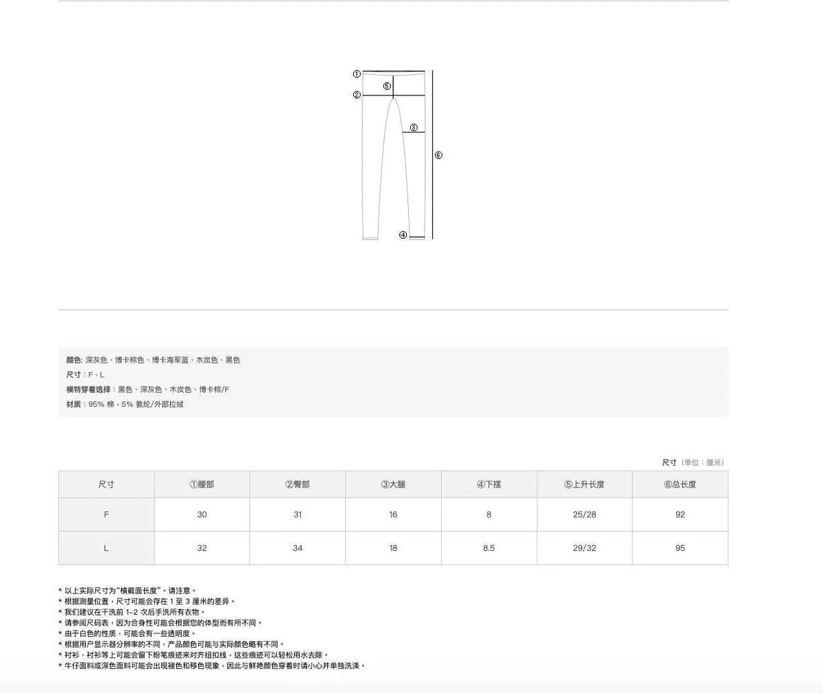 | 尺寸(cm) | 全長 | 腰寬 | 臀寬 | 褲襠 | 大腿寬 | 褲管 |