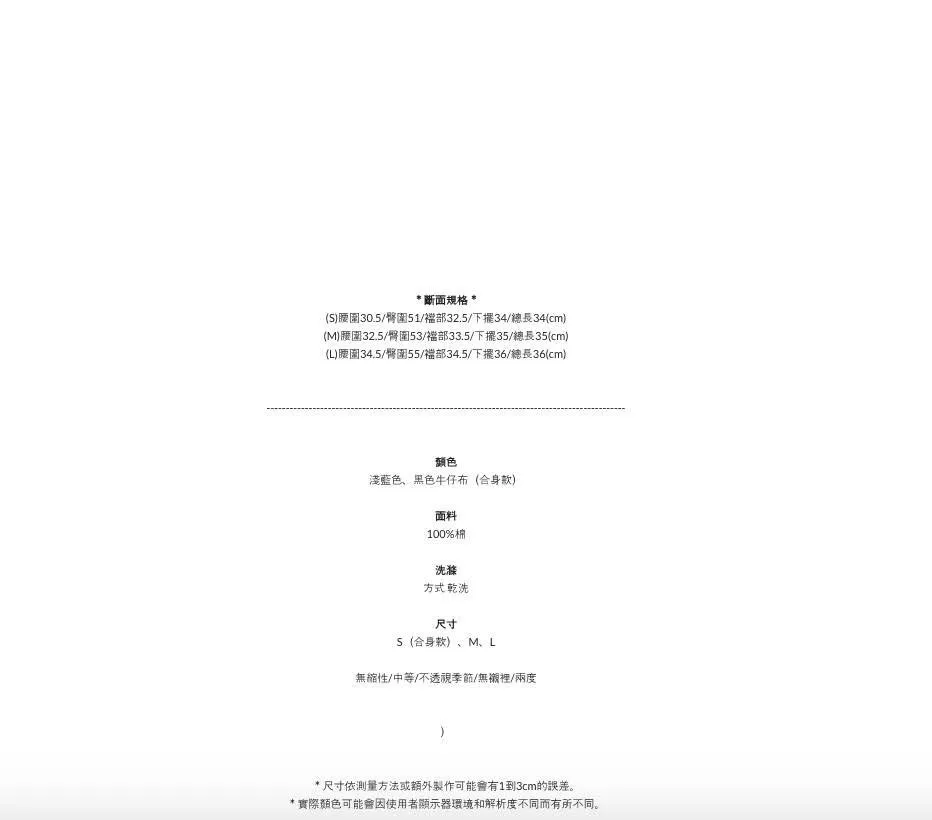 | 尺寸(cm) | 全長 | 腰寬 | 臀寬 | 褲襠 | 大腿寬 | 小腿寬 | 褲管 |